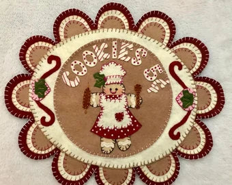 This is just the sweetest little gingerbread baker! Create this adorable design using wool or wool felt. There are templates included to make peppermints too! Display on a wall or table all winter long! Completed mat measures 10 1/2" x 12 1/2".