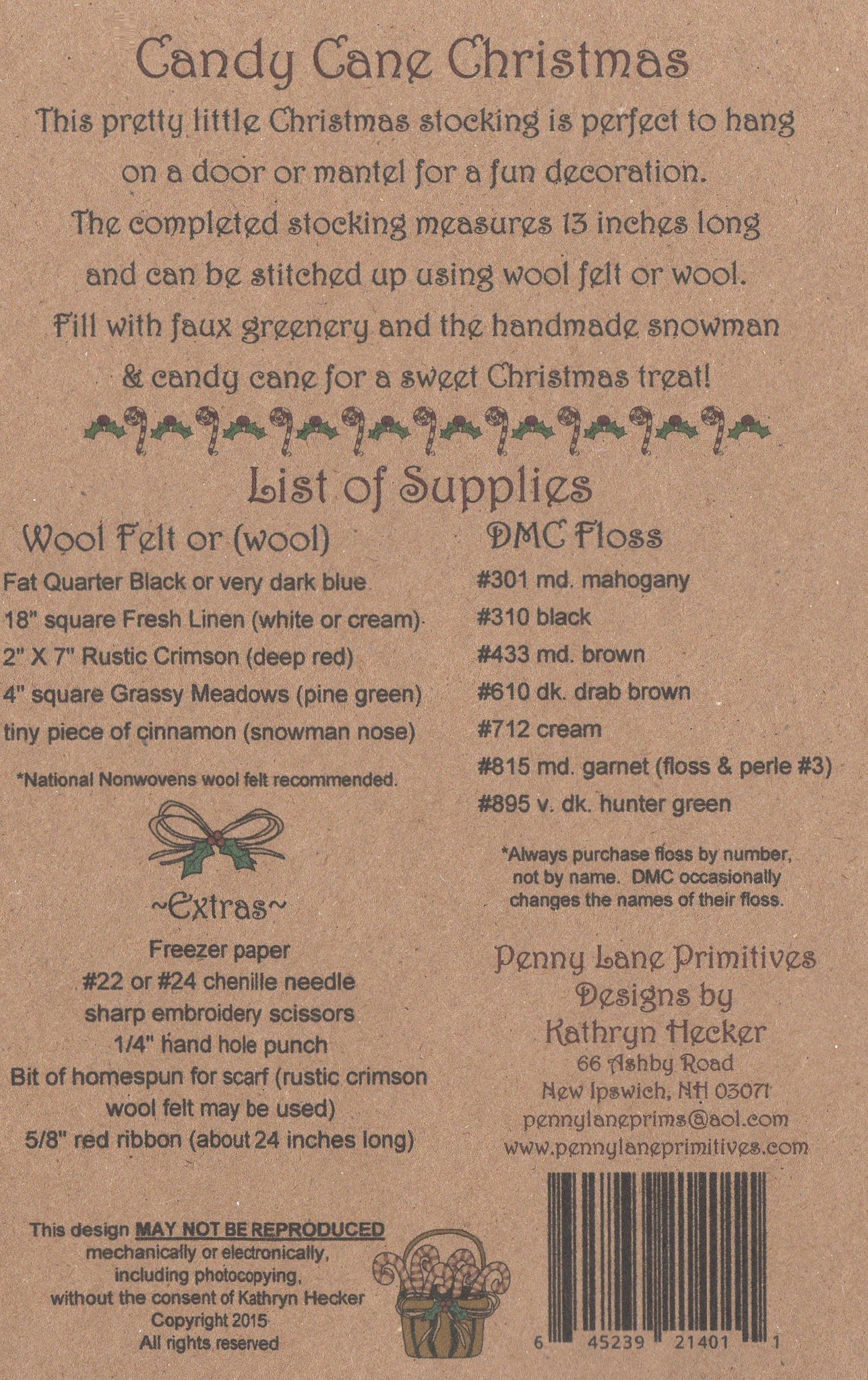 This pretty little Christmas stocking is perfect to hang on a door or a mantel for a fun holiday decoration. The completed stocking measures 13 inches long and can be stitched up using wool felt or wool. Fill with some pretty greenery and the handmade snowman & candy cane for a sweet Christmas treat!