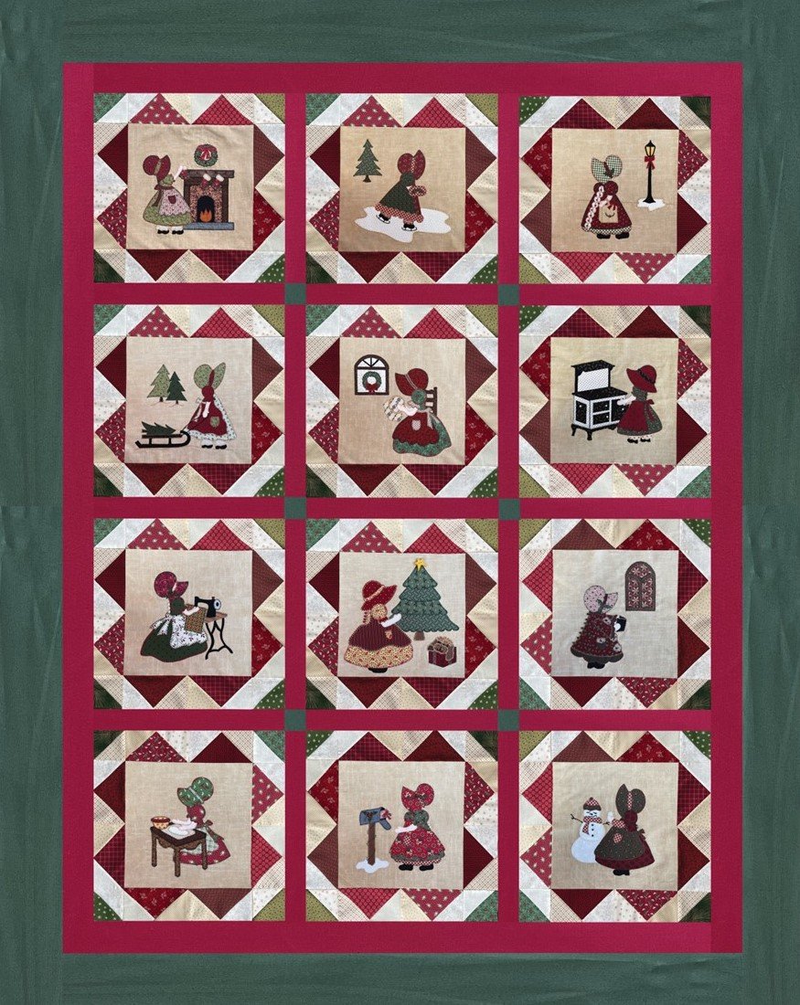 Using the classic Sunbonnet Sue pattern, she is worked up in the holiday spirit! Quilt finishes at 76" by 96".