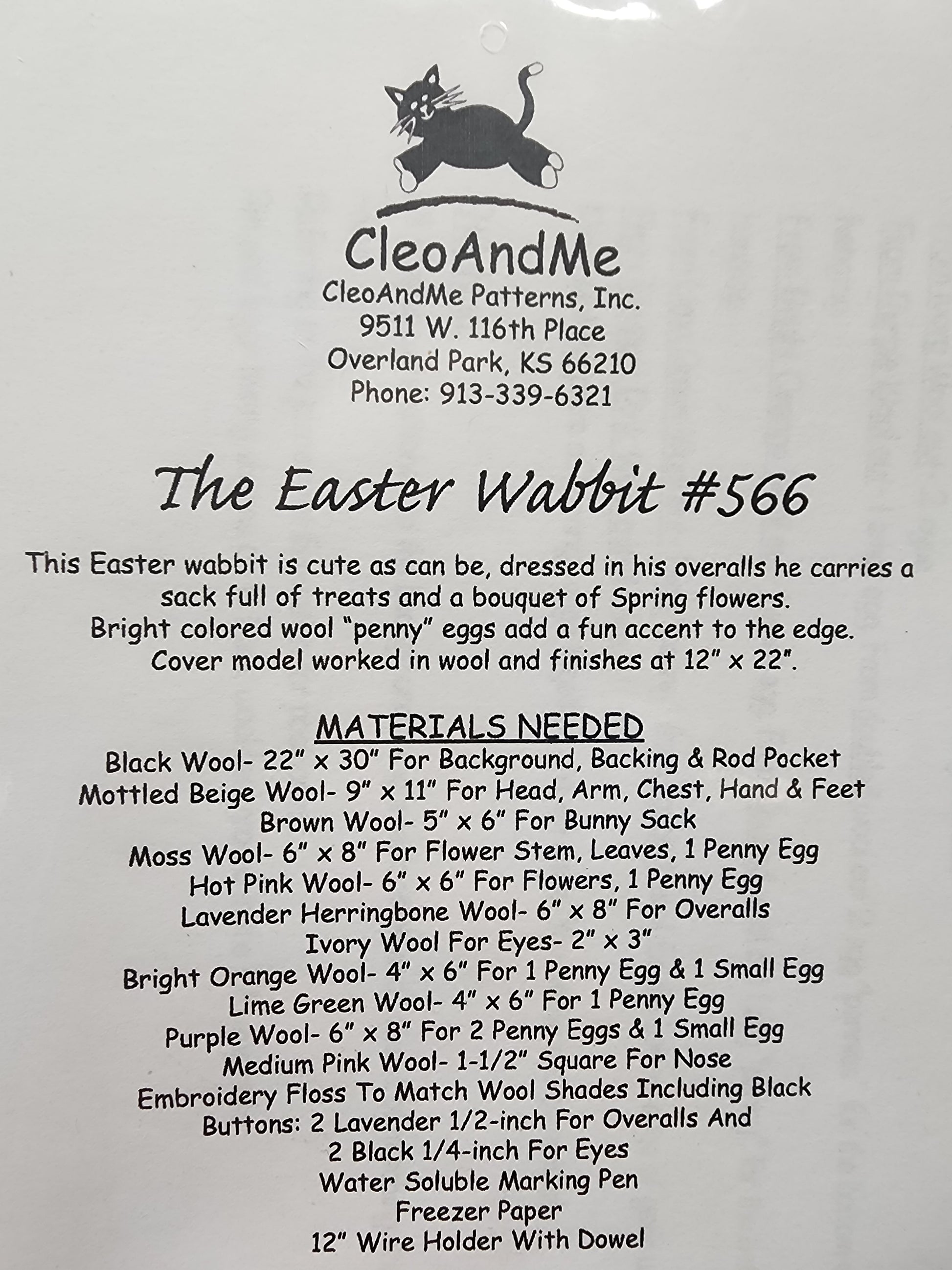 This Easter wabbit is cute as can be, dressed in his overalls he carries a sack full of treats and a bouquet of Spring flowers. Bright colored wool "penny" eggs add a fun accent to the edge. Cover model worked in wool and finishes at 12" x 22"