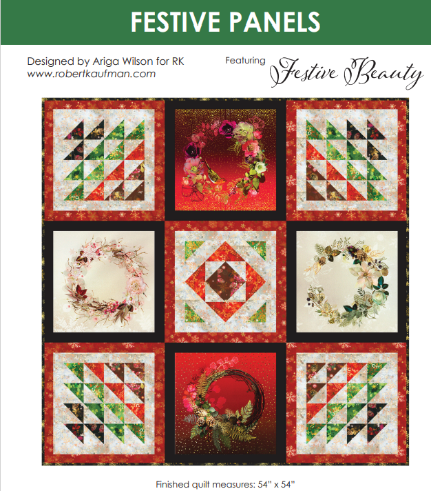 Kit includes pattern, panel and Robert Kaufman Festive Beauty fabrics for top and binding. Backing is not included. Finished quilt measures 54" x 54".