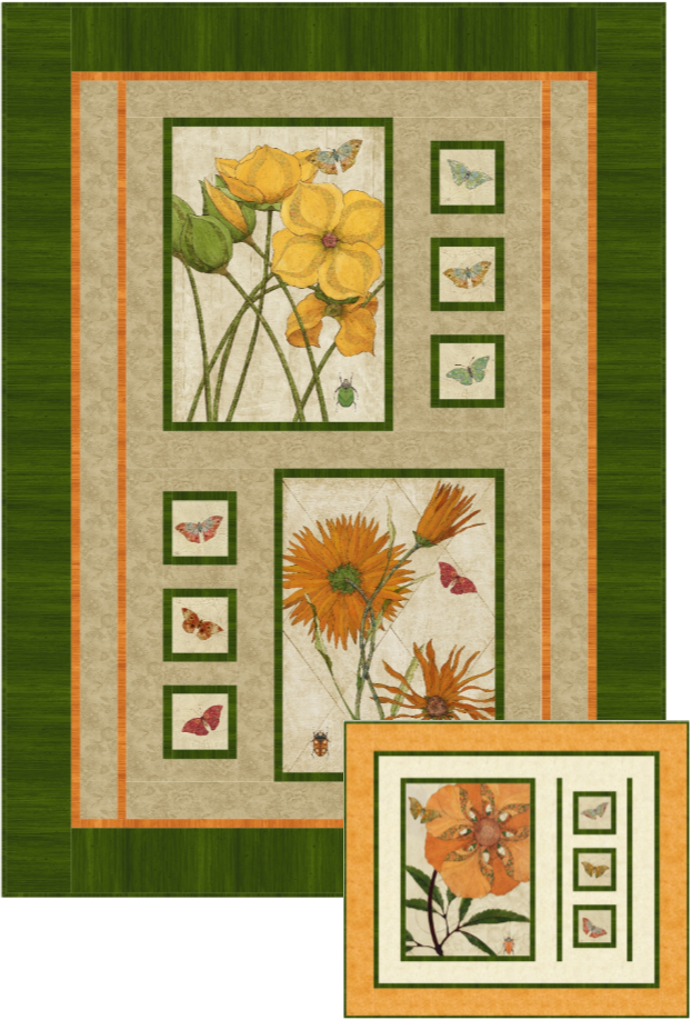 This pattern uses a panel from Northcott’s “Artisan Spirit Euphoria” fabric collection, but it would also work with any large-size panel and co-ordinating fabrics. The large panel sections are 23.5″ x 32.5″ and the small pieces are 6.5″ x 6.5″.