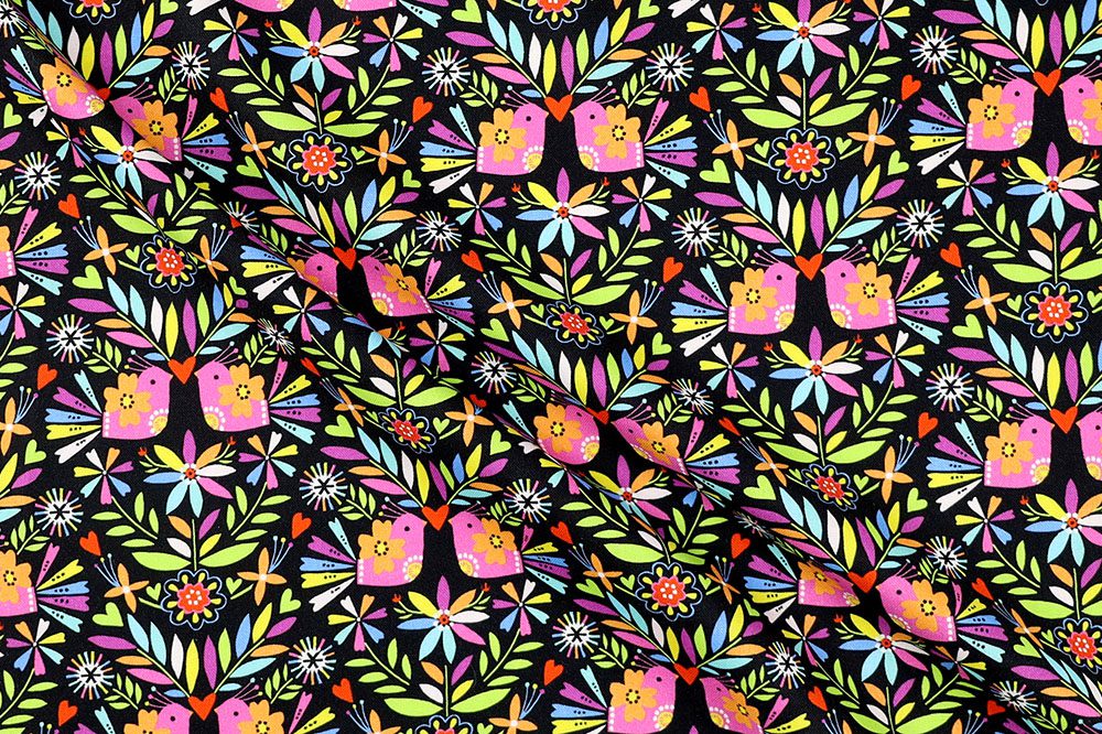 Cotton Quilting Print Folk Birds Black/Pink/Green/Blue/Orange/White is a vibrant 100% cotton fabric featuring a joyful folk-art inspired design. Pink birds adorned with floral details are nestled among blooming flowers, leafy branches, and tiny hearts, all set against a rich black background.