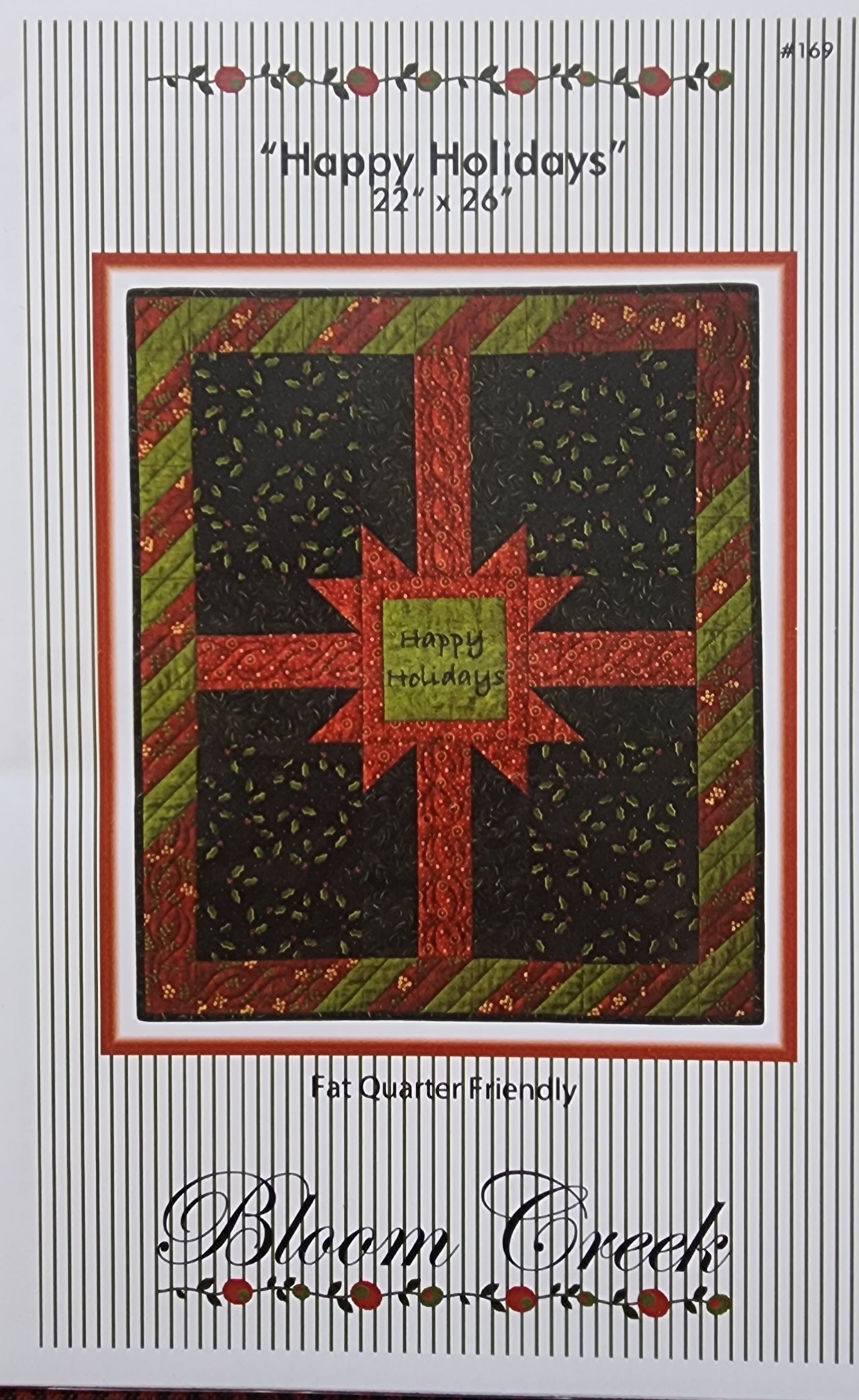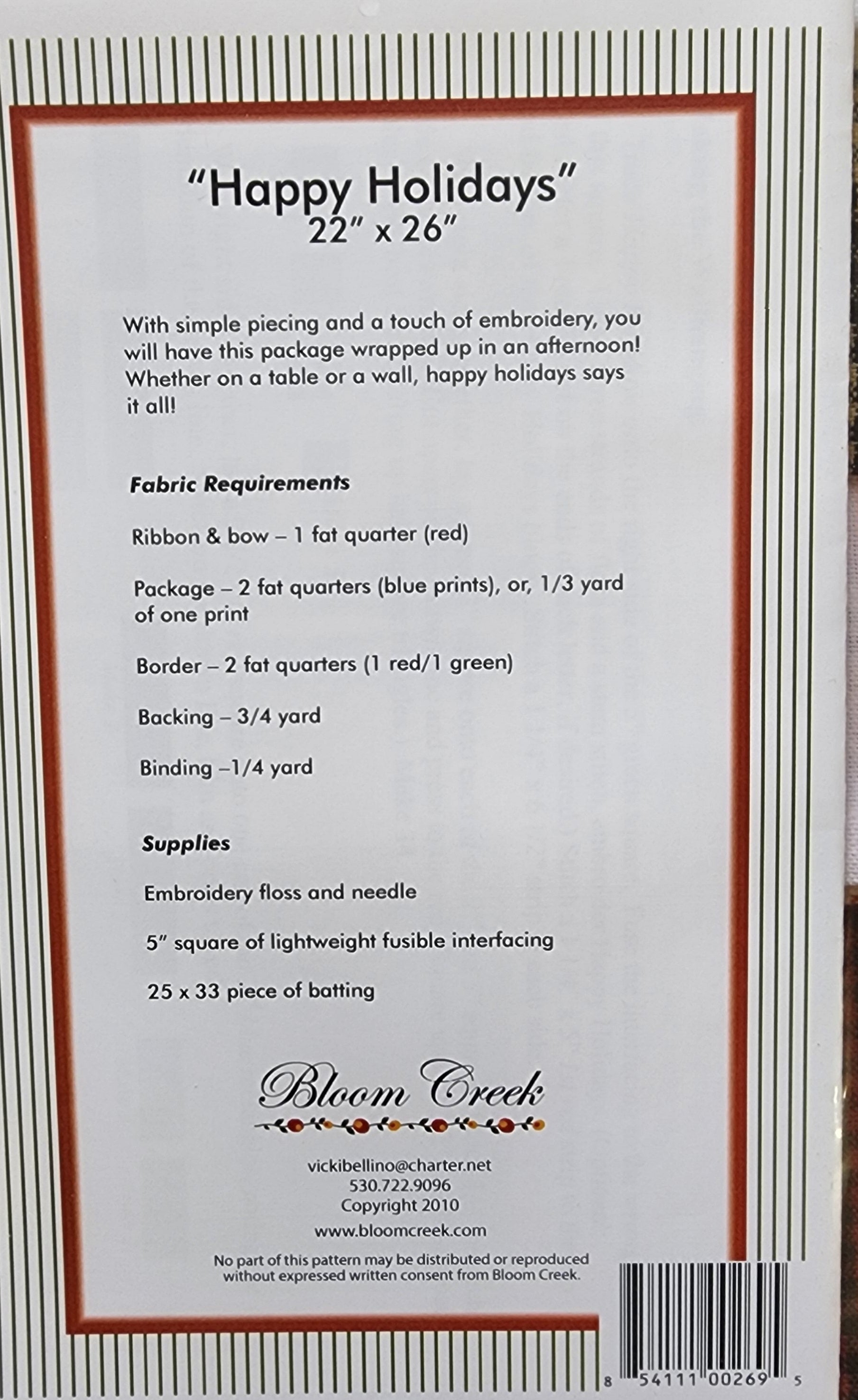 With simple piecing and a touch of embroidery, you will have this package wrapped up in an afternoon! Whether on a table or a wall, happy holidays says it all!