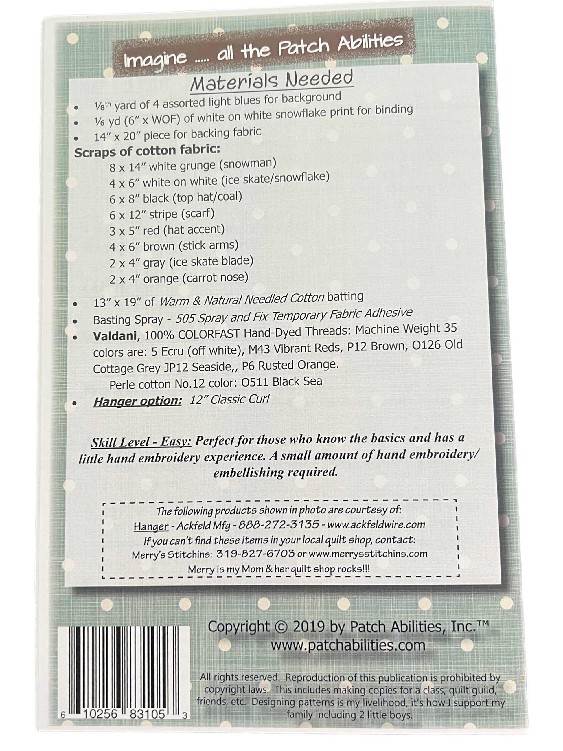 Long skinny quilted winter showman wall hanging featuring a fun snowman in his classic top hat ready for fun with ice skates draped over his stick arm. This pattern uses the quilt-as-you-go method! Decorate your home for Winter with this awesome Applique Quilt Pattern! This mini quilt will look great hanging in any room of your home welcoming in the winter season. Perfect gift for you friend or family member that love snowmen decor! This do-it-yourself mini quilt uses the machine stitch applique method.