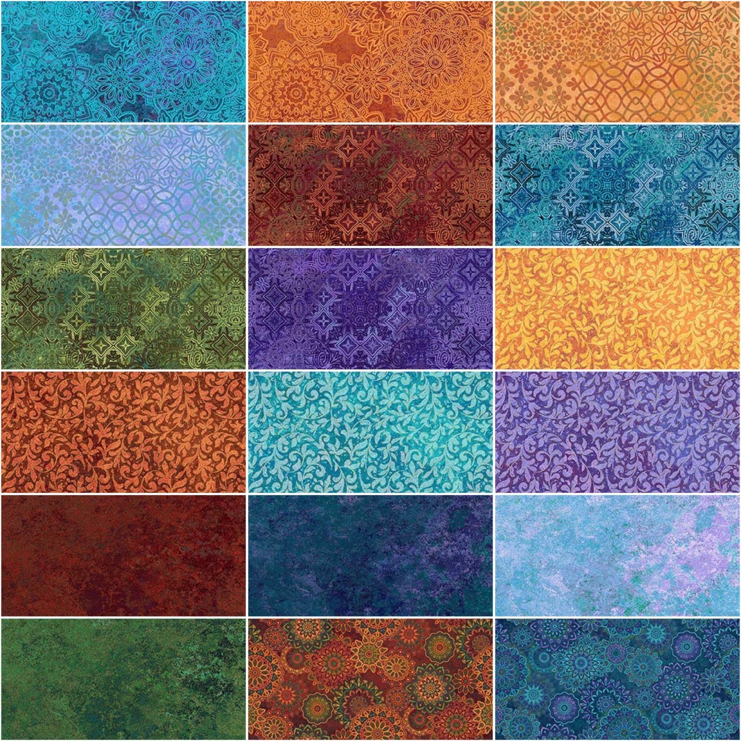 Jelly roll of geometric and abstract designs in warm and cool colors. Add a touch of mystique to your projects with the exotic Stonehenge - Marrakech collection by Linda Ludovico for Northcott. Experience the beauty of these gorgeous foulards, tiles, mandalas, scrolls, and textured solids in a cool Mediterranean colorway and warm Spice colorway.