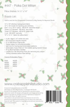 14in x 15in. Do you know how to fly stitch? You will after stitching this "knitted" mitten! Crayon tinting is a beautiful addition. The embroidery looks complicated, but it's very easy, and looks SO real!