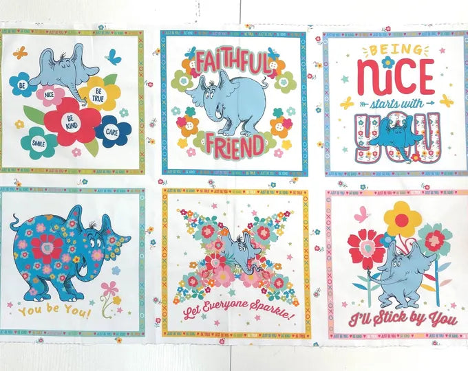 Celebrate Horton's kindness with this wonderful fabric panel from Robert Kaufman depicting characters from the beloved Dr. Seuss story.
