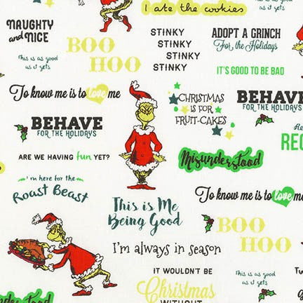 Designed by Dr. Seuss Enterprises and licensed to Robert Kaufman, How the Grinch Stole Christmas has arrived in delightful, fun fabrics from Robert Kaufman. All the endearing characters from Whoville come to life in these new designs. 44/45 inches. 100%
