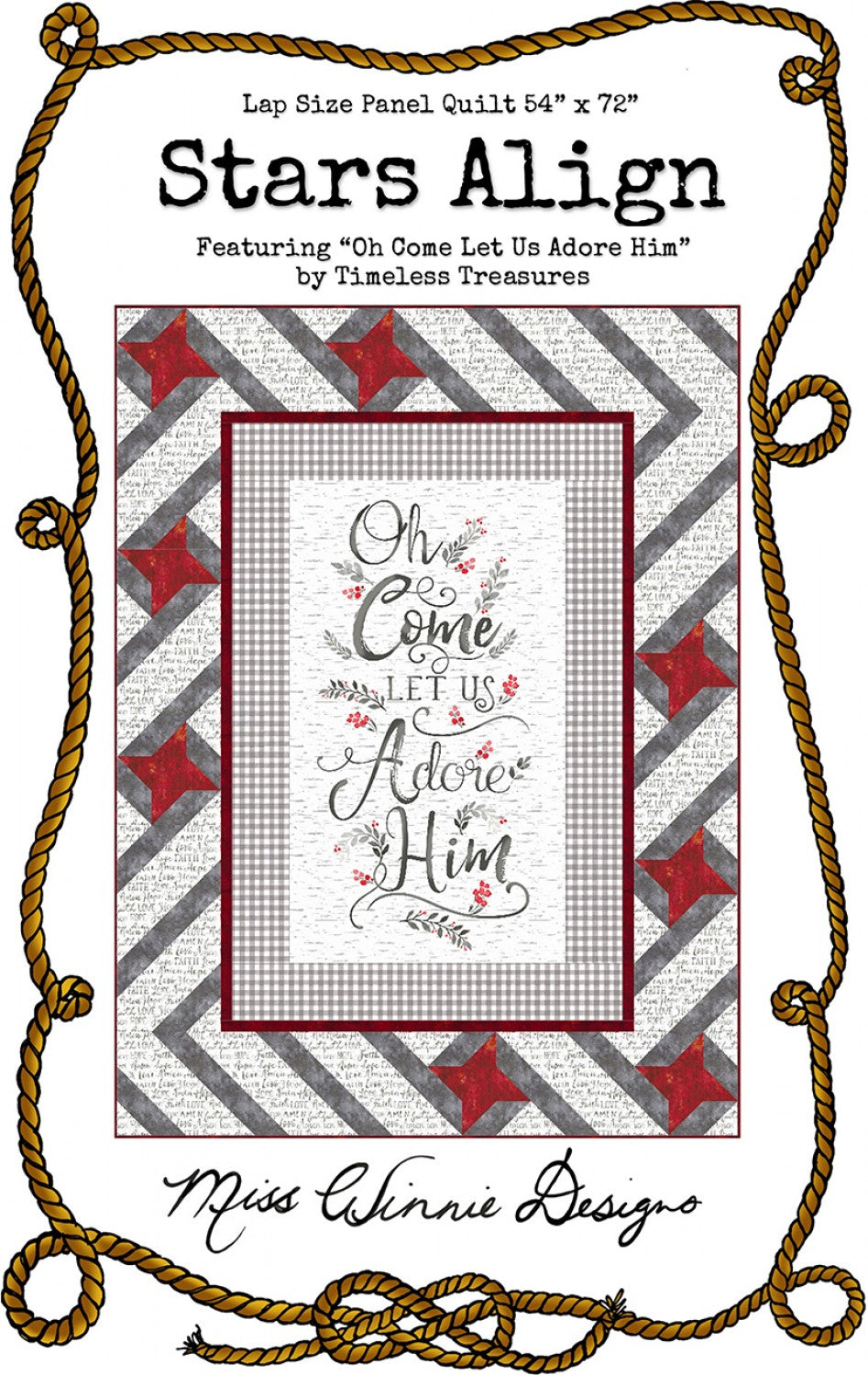 Stars Align Pattern MWDSA20 by Hanna Bourque from Miss Winnie Designs. Quick, easy 54" x 72" lap size quilt pattern that features Timeless Treasures "Oh, Come Let Us Adore Him" fabrics. Pattern can also be used for any 24" x 42" panel.