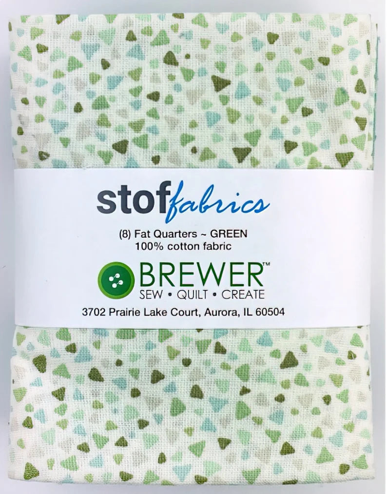 Stof Fabrics Quilter's Coordinates Bundle contains 8 FAT QUARTERS of assorted green prints. Quilters Coordinates by Stof are 100% Cotton-Oeko-tex certified fabrics. Pre-cut.