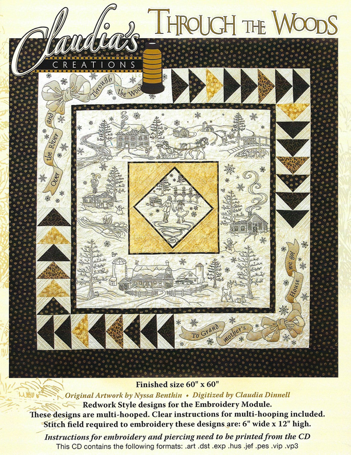 Through The Woods TW00215 by Claudia Dinnell from Claudia's Creations.  This is an absolutely gorgeous project from Claudia's Creations. "Through the Woods" depicts the cherished childhood memories, celebrating life and families together during the holidays and various wintery scenes. The design is done in black work. However, you can make your thread color in whatever colorway you like best. The designs are multi-hooped. Clear instructions are provided for the multi-hooping in the instructions. The minimum stitching field for these designs are 6" x 12" and a grid/template is needed to do the multi-hooping. This is a fabulous throw size quilt that you and your family will cherish for years to come. Formats Included: dst, exp, hus, jef, pes, vip, vp3, xxx. Finished Size: 60' x 60". Please be aware that software is not returnable.