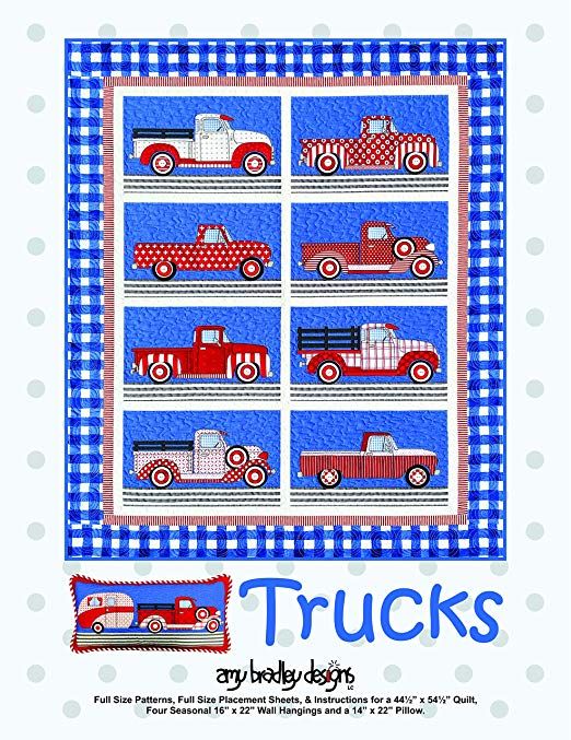 Vintage farm trucks have patina & charm... perfect backdrop for seasonal or holiday decorating! Trucks fusible applique quilt pattern from amy bradley designs. Fun & whimsical top showcases 8 distinct pickups in profile. Would make a darling nursery quilt. Contains full size patterns, full size placement sheets & instructions for a 44.5" by 54.5" quilt, four seasonal 16" by 22" wallhangings & a 14" by 28" bolster pillow.