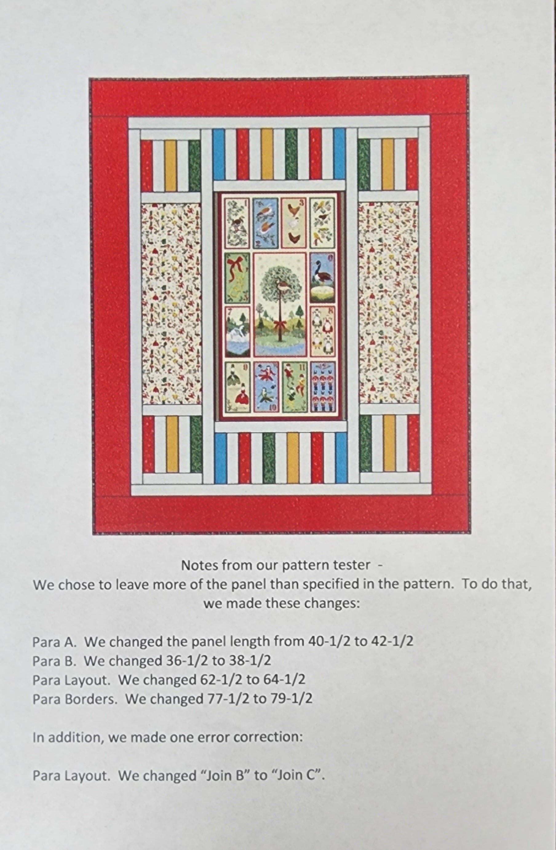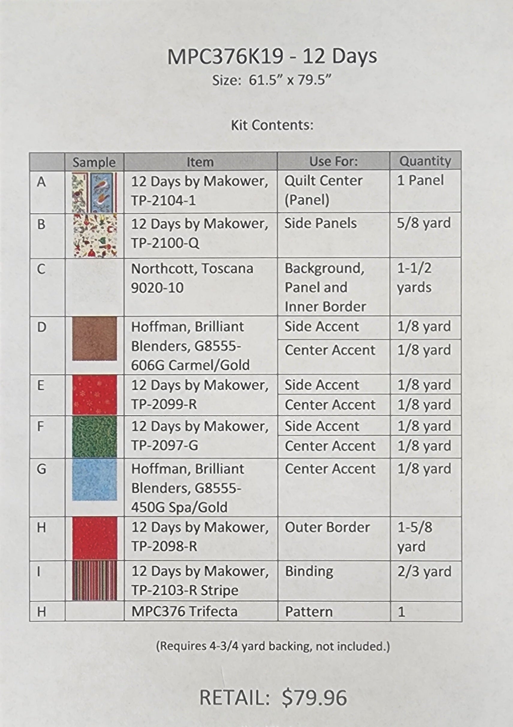 The Trifecta Pattern is converted to use the 12 Days by Makower fabric line. Included is everything to make the top for this quilt, requires 4 3/4 yards of backing that is NOT included. Finished size is 61 1/2"x 79 1/2".