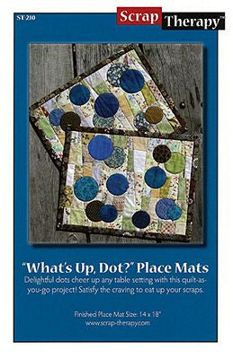 Scrap Therapy- Series 5 pattern. These quilt-as-you-go scrappy place mats are oh-so-yummy to make! Playful machine applique dots are added fast and easy with QuiltSmart SmartEase Circles! Finished Place Mat Size: 14" x 18"